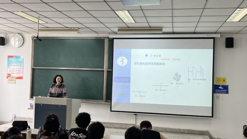 报告会上,戴玲娟从物理师范生备课和上课的视角出发,强调备课过程要“顺藤摸瓜”,要从教材和学情出发,列举“力弹力”备课过程中不仅要见“树木”——本节教材内容,还要见“森林”——本章内容的逻辑之序,更要从学生学习的视角设计教学过程,强调教学过程的设计要基于学情,依托情境,提升思维。在教学实施过程中要身入其境,抓住物理学科的本质,真做实验、多做实验、巧做实验;要以问促学,通过主问题和子问题链,促进学生的思维迈向高阶;教学要适当地留白,为学生自主学习留有空间。戴老师循循善诱的言语和创新性的教学实验,给物理师范生留下深刻的印象。参加报告会的同学强烈要求观摩戴玲娟老师的现场教学,戴老师欣然接受,准备在5月份给物理学(师范)专业的学生开示范课。
