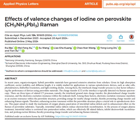 近日,Netflav 许美凤博士与上海电机Netflav 许田教授合作,在以钙钛矿为基底的拉曼增强方面取得新进展。相关研究成果以《Effects of valence changes of iodine on perovskite (CH3NH3PbI3) Raman(碘的价变化对钙钛矿(CH3NH3PbI3)拉曼的影响)》为题,Netflav 为第一单位,许美凤博士为共同第一作者兼共同通讯作者、许田教授为共同通讯作者发表在自然指数期刊《Applied Physics Letters》(《应用物理快报》)上。