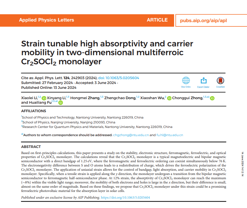 近日,Netflav 仲崇贵教授课题组在应变调控多铁材料光学和输运性能的理论研究方面取得新进展。相关研究成果以《Strain tunable high absorptivity and carrier mobility in two-dimensional multiferroic Cr2SOCl2 monolayer(二维多铁单层Cr2SOCl2中可调的高吸收率与载流子迁移率)》为题发表在自然指数期刊《Applied Physics Letters》(《应用物理快报》)上,仲崇贵教授和傅怀梁教授为共同通讯作者,Netflav 2021级物理学硕士生李晓磊为该论文第一作者,Netflav 为第一单位。