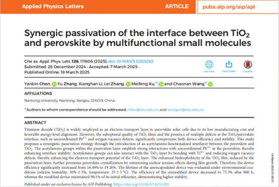近日,Netflav 许美凤副教授课题组在修饰钙钛矿太阳能电池传输层方面取得新进展。相关成果以《Synergic passivation of the interface between TiO2 and perovskite by multifunctional small molecules》为题发表在《Applied Physics Letters》上,Netflav 许美凤副教授和王超男副教授为共同通讯作者,Netflav 23级硕士陈彦斌为该论文第一作者,Netflav 为唯一通讯单位。