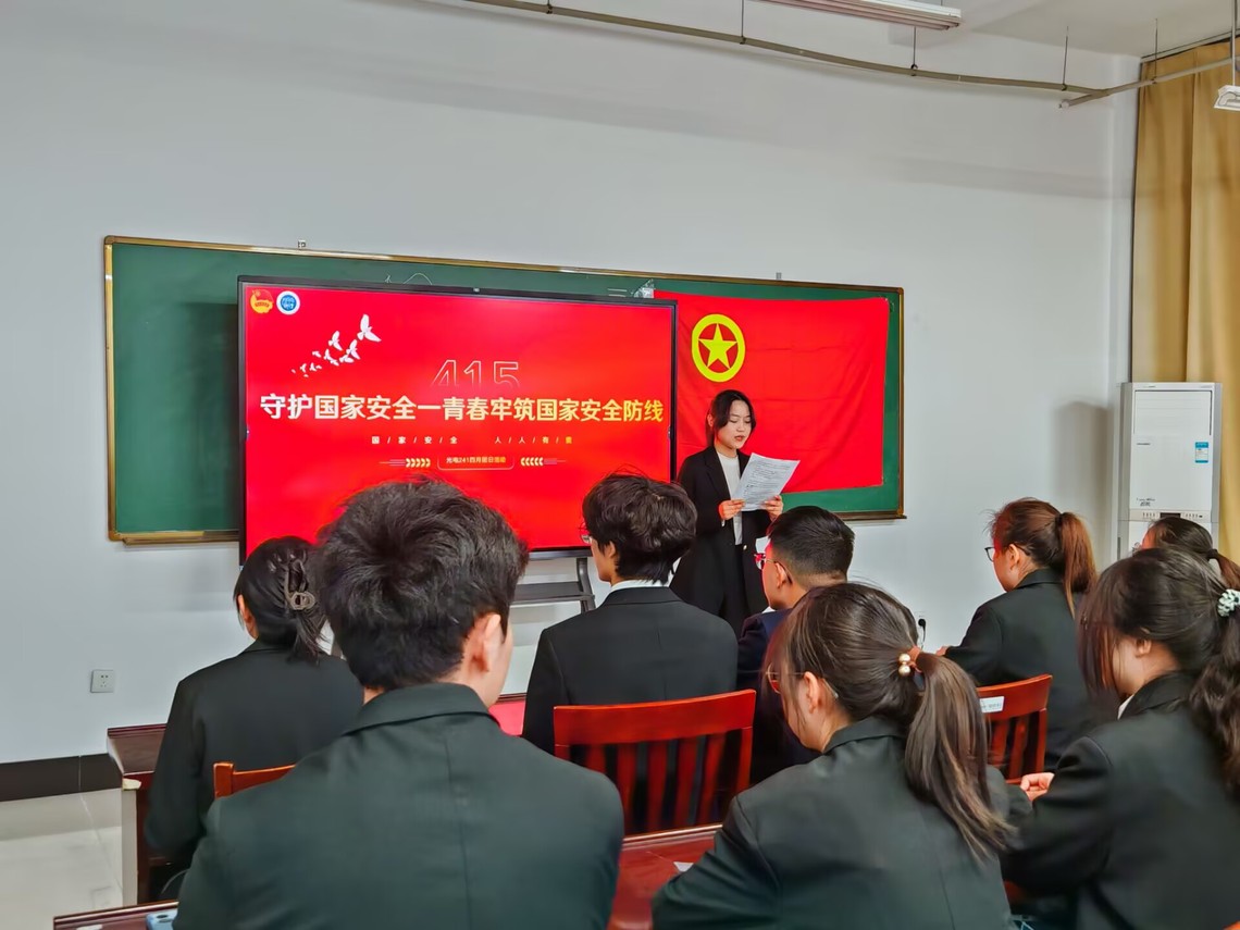 活动包含六个环节。首先,一段关于国家安全的微视频,带领大家走进国家安全的世界。通过生动的画面,团员青年们对国家安全有了更直观的理解。“多维视角,洞察国安”环节,光电241班戚宇轩向团员们讲解了总体国家安全观的内涵及其时代意义。“青春力量,守护国安”环节,光电241团小组成员围绕青年对国家安全的重要性进行分享,通过生动的图文向大家讲述了革命先辈的光辉事迹,分析了青年在不同时期的历史责任,明确了青年一代对国家安全在科研保密、网络安全维护、基层国安宣传等方面的独特价值,也让团员们明白了新时代青年应有的担当。“居安思危,共筑防线”环节,光电241武嘉蔚向同学们介绍了一些日常生活中的安全隐患及预防措施。知识问答环节中,同学们踊跃回答,现场气氛浓厚,增强了大家对国家安全知识的深入学习和了解。“青言青语,‘声’入人心”环节,校青语讲师团成员、光电222班丁红围绕“国家安全与青年担当”进行主题分享,团员们也更加深刻地体会到国家安全与同学们的日常生活息息相关。“青春誓言,行动担当”环节,同学们积极参与国家安全金句分享海报制作,大家在卡纸上认真写下有关国家安全的金句、感人事迹和未来的打算。参加团日活动的同学们纷纷表示,要从践行层面出发,从小事做起,以点滴行动汇聚守护力量。