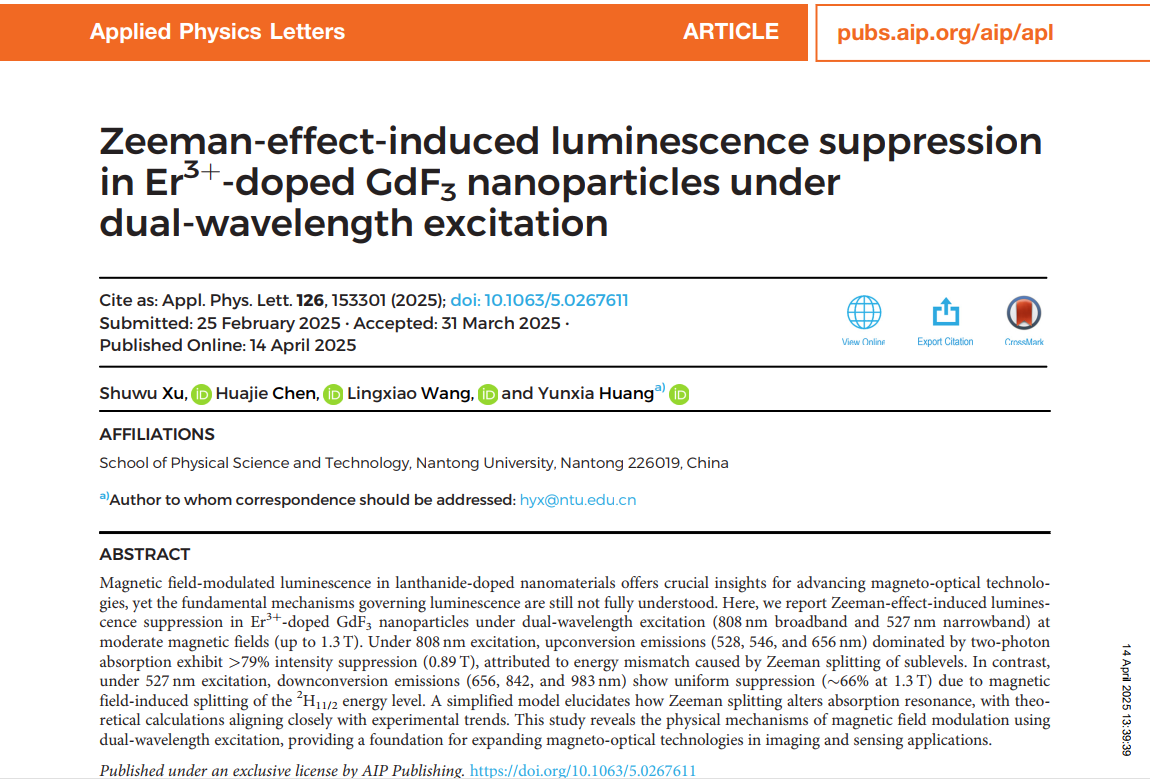 近日,Netflav 徐淑武和黄云霞老师在研究稀土掺杂纳米粒子的荧光发光方面取得进展,相关研究成果以“Zeeman-effect-induced luminescence suppression in Er3+-doped GdF3 nanoparticles under dual-wavelength excitation”为题发表在自然指数期刊《Applied Physics Letters》上,二人共同指导的2022级硕士研究生陈华杰为该论文共同第一作者,论文实验部分以项目合作形式由陈华杰在华东师范大学完成。