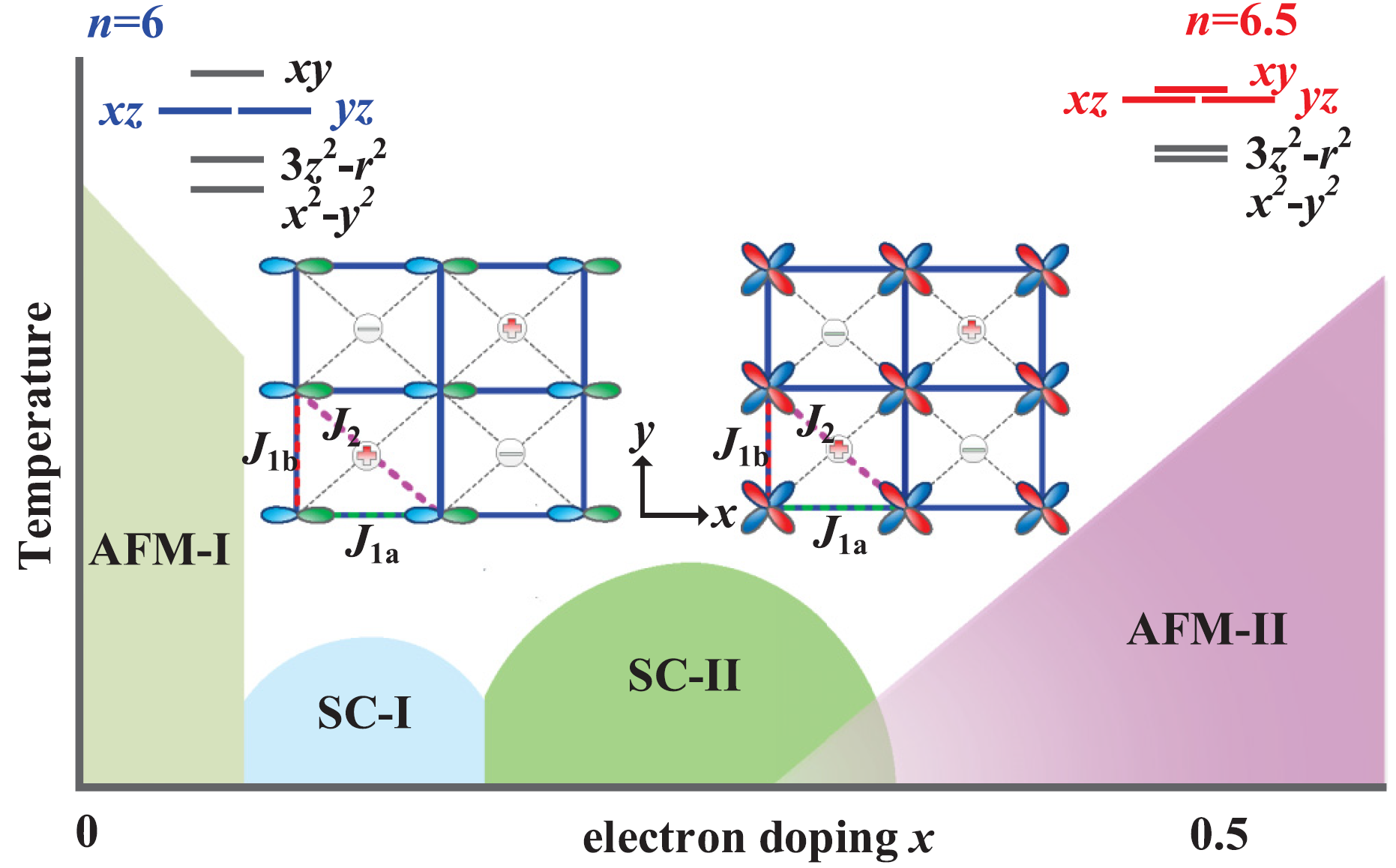 非常规超导体系相图中超导相一般毗邻有序母相(自旋/电荷/轨道有序),具有单穹顶结构超导相图。近年来,实验发现一系列非常规铁基超导材料具有反常的双穹顶结构的磁有序/超导相图。然而其起源仍然不清楚,理论上也缺乏统一理解。该团队从理论上研究了三种代表性的具有双穹顶结构相图的铁基超导体系,LaFeAsO1-xHx、LaFeAs1-xPxO和KFe2As2。结果发现,完全简并且具有面内C2对称的各向异性dxz/yz轨道主导第一种磁有序和较低Tc超导相;而由于掺杂或替换诱导的化学压或外部压力改变,具有面内各向同性C4高对称的准简并dxy或d3z2-r2轨道驱动第二个穹顶相的出现,从而主导第二种具有更高Tc的超导相。由此提出了双穹顶磁有序/超导相图的统一轨道驱动的物理机制,并揭示了在铁基超导材料中存在由面内C2和C4不同轨道对称性主导的两类完全不同的超导相,因此轨道物理在这类铁基磷族超导体系的双穹顶磁有序/超导相的起源上起了非常重要的作用。同时,还给出了多轨道超导体系中超导配对态的自旋与轨道涨落匹配规则。这些都为以后寻找更高超导转变温度Tc的非常规超导材料提供了重要的理论指导。