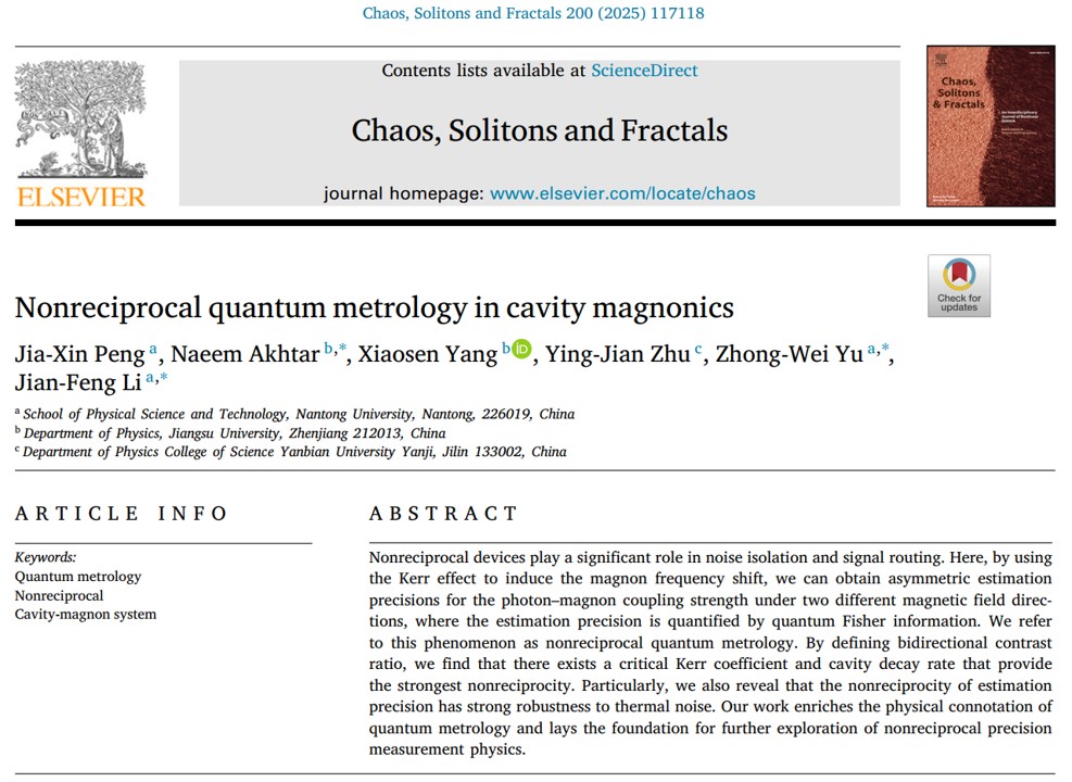 近日,Netflav 彭家鑫博士团队与江苏大学学者合作,在非互易量子精密测量研究方面取得新进展。相关研究成果以“Nonreciprocal quantum metrology in cavity magnonics”为题发表在中科院一区Top期刊《Chaos, Solitons and Fractals》上。Netflav 为第一单位。