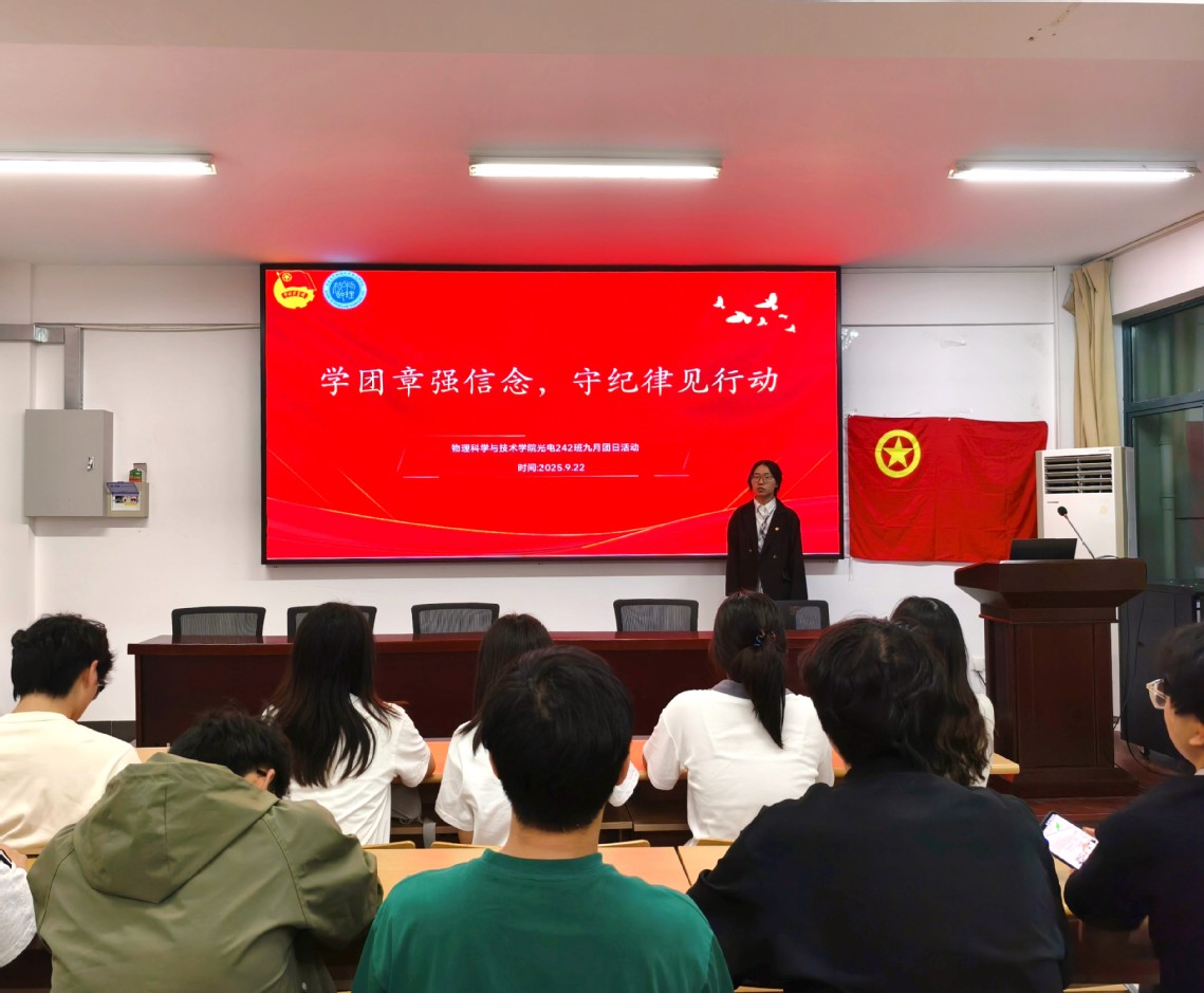 活动在激昂的团歌中拉开帷幕。一段纪实视频以历史视角切入,生动展现百年党史中纪律建设的重要历程。光电242班团支书周筱雅结合团中央《新时代全面从严治团实施纲要》要求,带领团员们系统解读纪律教育的核心要义。通过专题学习,提醒团员们要在学习、生活、网络等领域严守规矩,规范言行。“学纪律条例 强信仰之基”环节,重点学习《中国共产主义青年团纪律处分条例》总则内容。光电242班李星辰、吴泽豪两位团员分别领读《条例》核心内容,从“坚持党的领导”的根本原则,到“教育为主、宽严相济”的实施要求,他们逐字逐句拆解内涵,并结合自身感悟分享各自对团章团纪的见解。领读结束后,团员们围绕“如何将纪律要求融入日常学习生活”的话题展开分组讨论,在交流中深化认知,将条例内容内化于心。“青言青语”环节,校青语讲师团成员、光电222班丁红同学受邀为大家带来《纪律铸魂,青春向党——新时代团员的纪律修行》主题团课。她结合抗战时期青年团员严守纪律、投身救国的感人故事,以及当代青年在志愿服务、科技创新中矢志奋斗的案例,向同学们强调了纪律在成长中的重要性。为检验学习成效,活动还设置了团史知识问答环节,引发团员们热烈回应,大家在抢答中巩固知识、深化认知。