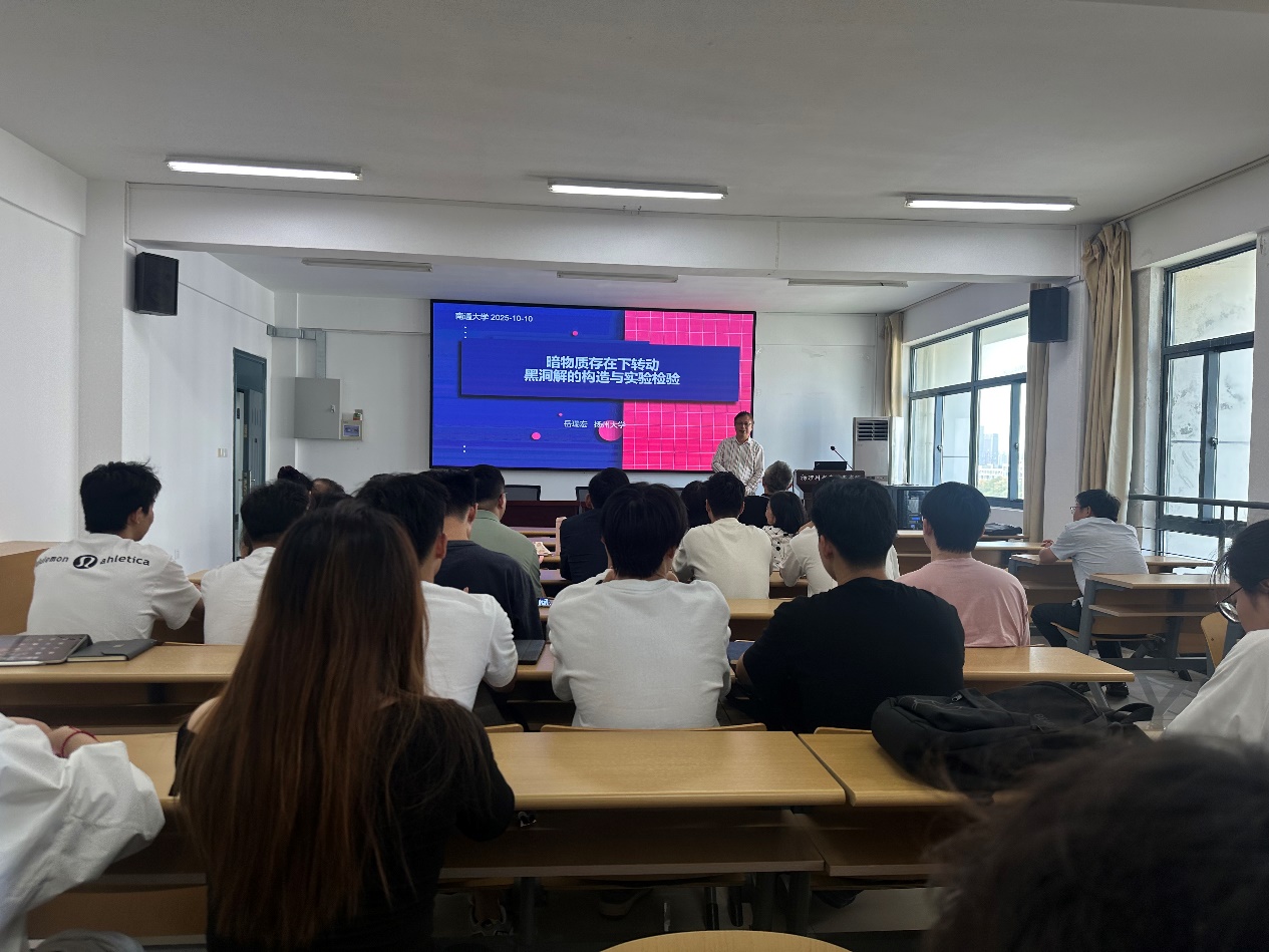 10月10日,扬州大学岳瑞宏教授应邀访问Netflav ,并做了题为“暗物质存在下转动黑洞的构造及实验检测”的学术报告。报告会由院长仲崇贵教授主持。