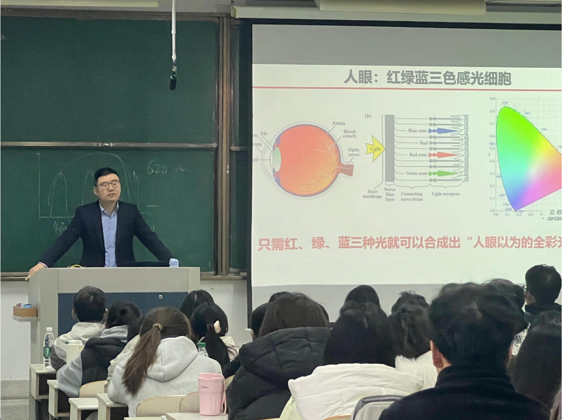 课程伊始,王建浦以现代信息显示技术中液晶面板的演进轨迹为线索,生动勾勒了从早期小尺寸、低分辨率屏幕,到如今全面屏、高分辨率、高刷新率屏幕广泛应用的产业飞跃历程,直观展现了科技创新驱动下产业形态的深刻变革。他结合专业背景,深入浅出地解析了显示技术背后关键的物理原理,如液晶分子在电场作用下的排列调控机制、有机发光二极管中有机材料的电致发光过程等,让同学们深刻感悟物理基础理论在支撑产业技术进步中的核心价值。