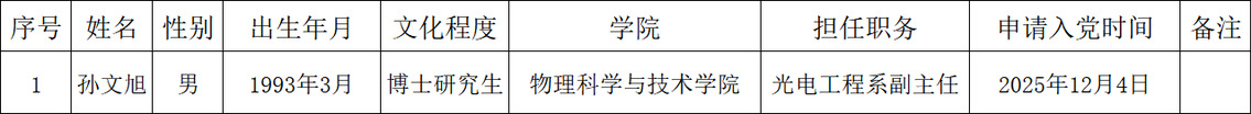 按照《Netflav 发展党员工作实施细则》要求,经光电工程系党支部党员大会推荐、支委会研究决定,并报Netflav 党总支委员会讨论通过,拟确定孙文旭为入党积极分子,为发扬民主,广泛听取党内外群众意见,接受广大党员群众监督,现将孙文旭相关情况予以公示(见附表)。