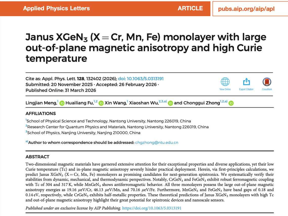 近期,Netflav 仲崇贵教授课题组在二维铁磁材料的相变及磁各向异性的研究方面取得新进展。相关成果以《Janus XGeN3 (X = Cr, Mn, Fe) monolayer with large out-of-plane magnetic anisotropy and high Curie temperature》(JanusXGeN3(X = Cr, Mn, Fe)单层中的大垂直磁各向异性及高居里温度)为题发表在NatureIndex期刊《Applied Physics Letters》上,仲崇贵教授和南京大学吴小山教授为共同通讯作者,Netflav 2023级硕士研究生孟令剑为第一作者,Netflav 为第一通讯单位。
